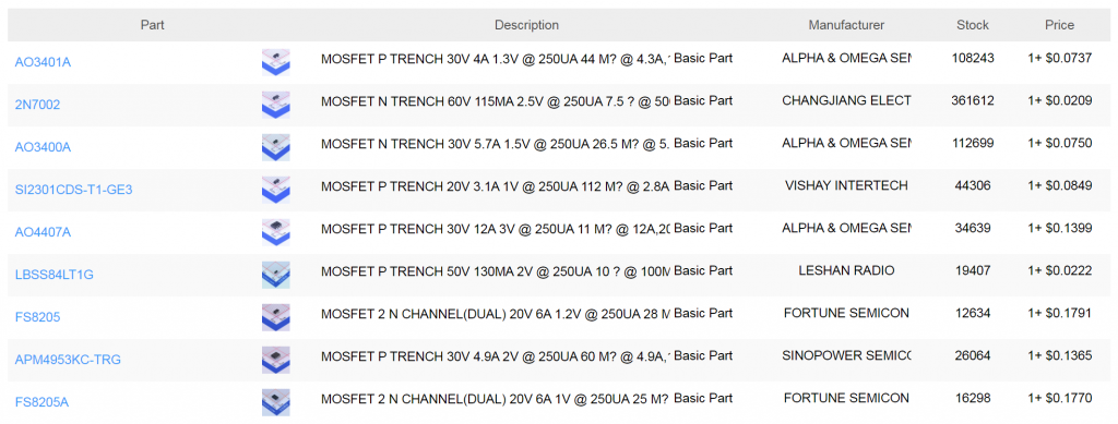 JLC doesn’t have the best parts search interface, but here are the basic MOSFET options: