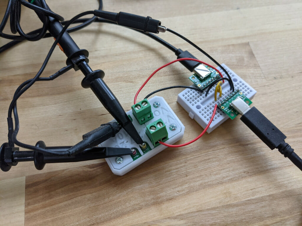 This is the USB-C probing setup using two USB-C breakout boards (with the pulldown resistors removed), and my cheap DIY current probe board.